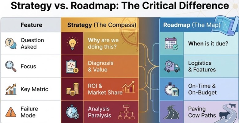 A Roadmap is a Logistic Tool. It focuses on time, budget, features, and resource allocation. It answers the questions: "When will we go live?" and "How much will it cost?" It is linear, predictable, and comforting.