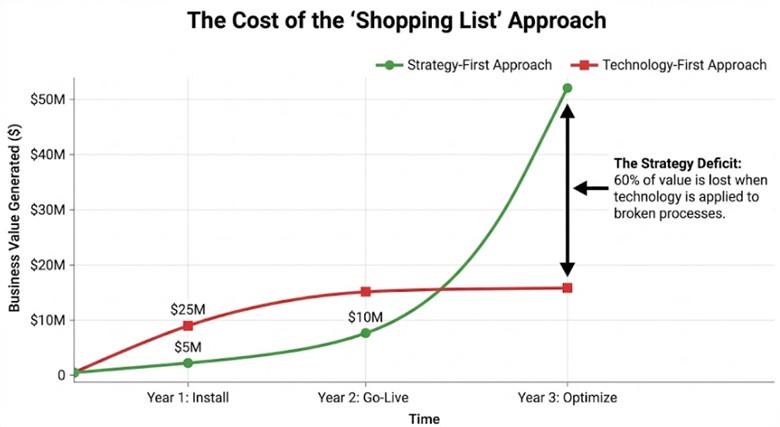 Technology is not Strategy: Buying SAP or Oracle is a procurement decision, not a competitive advantage. The "Shopping List" Trap: A roadmap tells you when you are spending money. A strategy tells you why that spending creates value. The 3-Step Fix: True Digital Strategy requires Diagnosis (What is the friction?), Guiding Policy (How do we deal with it?), and Coherent Action (The Roadmap).